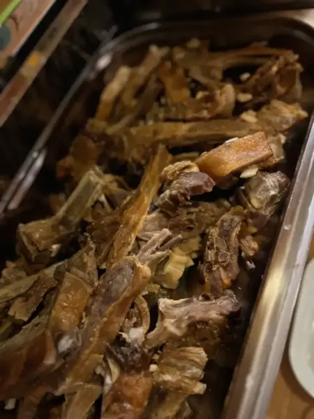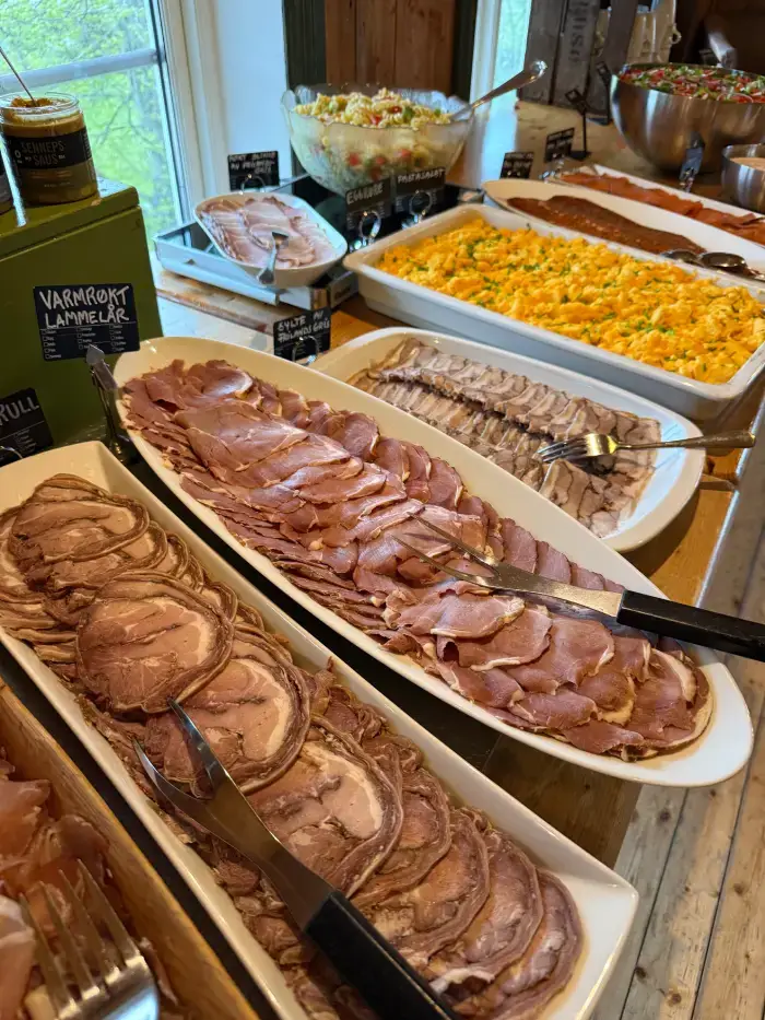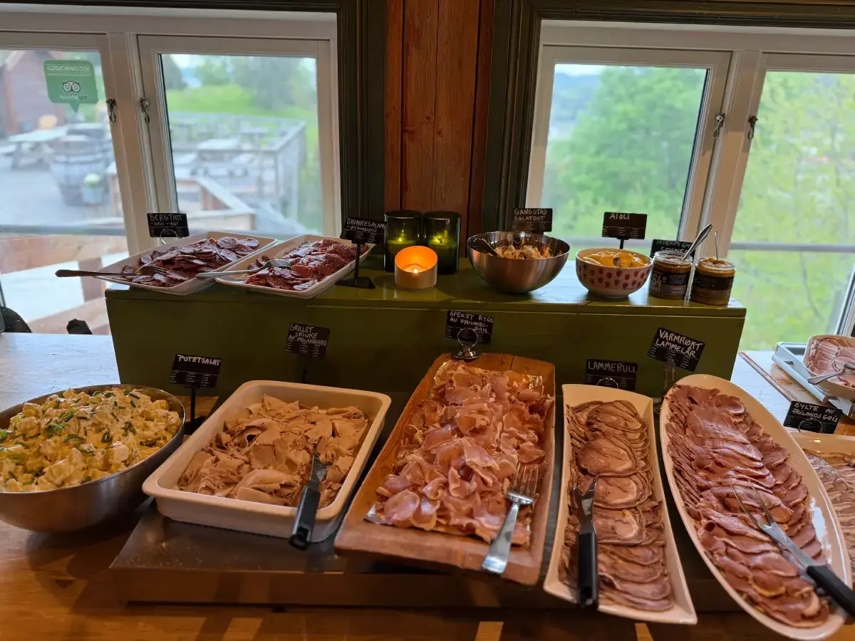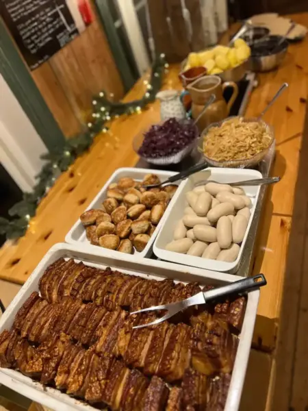 Velkomstdrikk, buffet av gårdens ribbe av frilandsgris og pinnekjøtt med tilbehør, og kaffe & dessert.