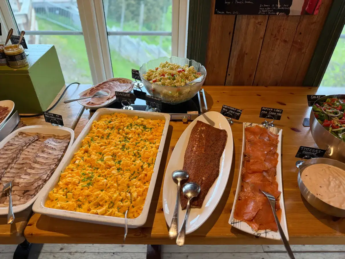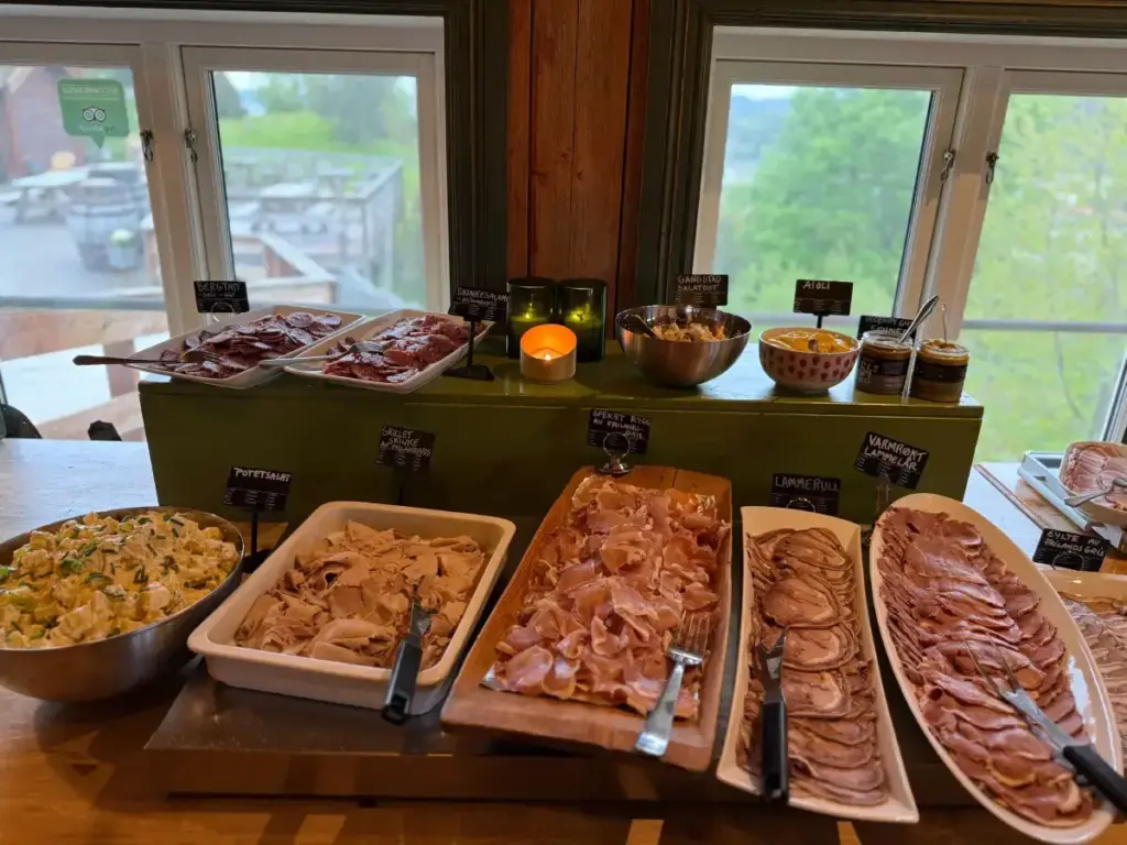 Rettene serveres som buffèt. Enklere menyer kan også bestilles. Barn under 7 år halv pris, barn under 2 år gratis.